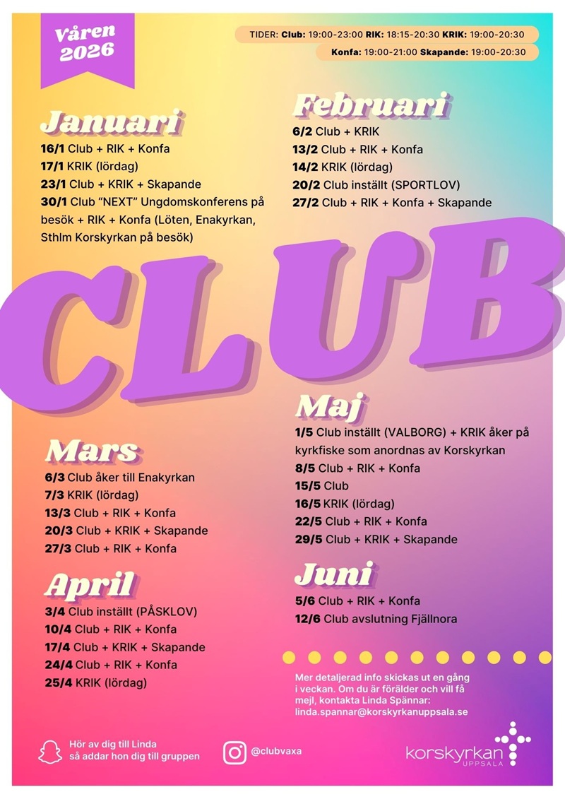 RIK börjar 17:30 och slutar 20:30 då fikat börjar på Club. De som är yngre än årskurs 7 behöver åka hem efter RIK, eftersom Club är för högstadieelever och uppåt.